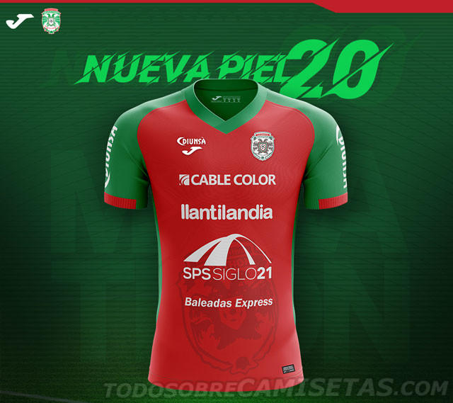 nueva Camiseta de la 2ª equipación CD Marathón 2020 La indumentaria de visitante, por su parte, toma al rojo como color principal en un diseño un poco más sencillo con mangas de color verde y el escudo del club presente en marca de agua sobre la parte inferior del frente de la casaca.
