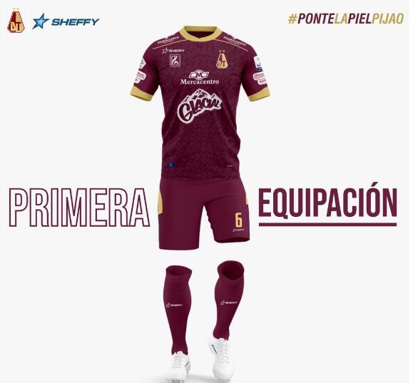 La nueva Camiseta de la 1ª equipación Deportes Tolima 2020 local es principalmente vinotinto, agregando un pattern camo pixelado al frente que contrasta contra el cuello y puños dorados. Shorts y medias planos completan el uniforme local de los Pijaos.