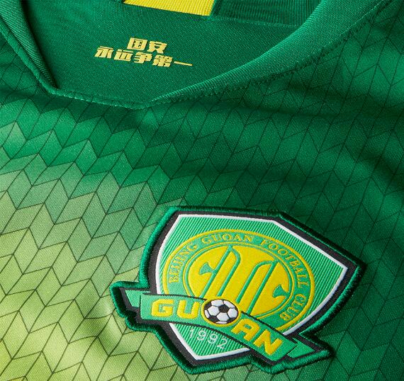 La equipación local del Beijing Guoan mantiene el color verde tradicional del club y le añade varios detalles en amarillo. Estos pueden verse en los puños de las mangas, en la banda transpirable de la nuca y en el mismo logo de Nike ubicado en el pecho derecho.