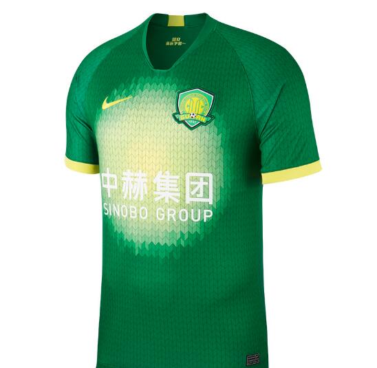 La equipación local del Beijing Guoan mantiene el color verde tradicional del club y le añade varios detalles en amarillo. Estos pueden verse en los puños de las mangas, en la banda transpirable de la nuca y en el mismo logo de Nike ubicado en el pecho derecho.