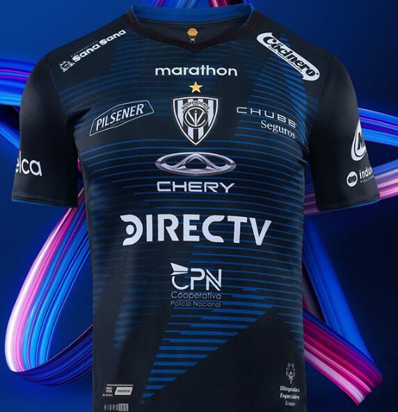 nueva Camiseta de la 1ª equipación Independiente del Valle 2020 Como no podía ser de otra manera, las nuevas camisetas toman inspiración del título internacional logrado por el club de Sangolquí. Ambas – local en negro/azul, de cuello con reborde posterior que se refleja en los puños. Un patrón de estrellas con franjas horizontales decora el panel frontal, mientras que mangas y espalda se mantienen lisas. El escudo se ubica al centro del pecho, acompañado por una estrella dorada en honor a la Sudamericana, cuyo trofeo se puede ver al interior del cuello. El lema “Sé diferente, sé Independiente” se posa en lo alto de la espalda.