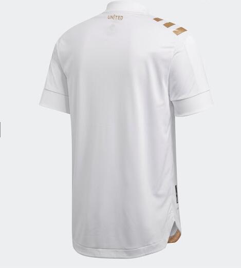 nueva Camiseta de la 2ª equipación Atlanta United 2020 Después del primer partido inaugural de color gris / rojo 2017 y el número gris claro / melocotón 2018, el equipo de visitante Atlanta United 2020 de Adidas es principalmente blanco con las 3 rayas y logotipos que aparecen en ‘dorado claro de fútbol’.