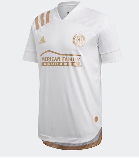 nueva Camiseta de la 2ª equipación Atlanta United 2020 Después del primer partido inaugural de color gris / rojo 2017 y el número gris claro / melocotón 2018, el equipo de visitante Atlanta United 2020 de Adidas es principalmente blanco con las 3 rayas y logotipos que aparecen en ‘dorado claro de fútbol’.