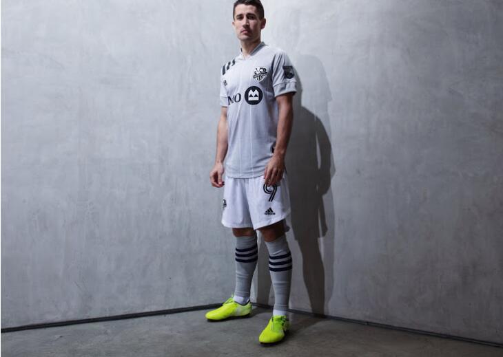 La nueva Camiseta de la 2ª equipación Montreal 2020 es principalmente gris oscuro, con detalles en blanco y negro. Las rayas blancas están presentes en la parte delantera de la nueva camiseta de fútbol 2020 2020 de Impact de Montréal, mientras que el cuello y los puños también son blancos. Las 3 rayas en el hombro derecho, así como los dos logotipos en el cofre, son negros.