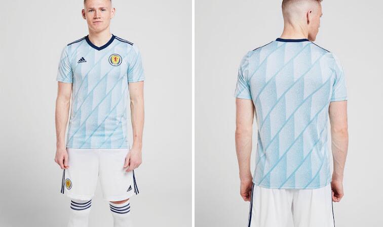 La nueva Camiseta de la 2ª equipación Scotland 2020-21 presenta un interesante combo de colores que nos recuerda a Argentina: es blanco con aplicaciones azul marino y un patrón gráfico azul cielo.