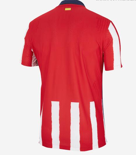 nueva Camiseta de la 1ª equipación Atlético Madrid 2020-21 Hay cinco rayas rojas y cuatro blancas en la parte delantera de la camiseta de local Nike Atlético 2020-21, siendo esta última de un ancho más pequeño que la anterior. Las rayas continúan en las mangas, mientras que la espalda es predominantemente roja.